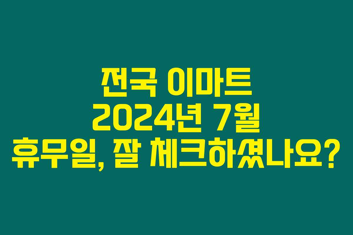 이렇게 정리된 정보를 통해 2024년 7월 이마트 휴무일을 스마트하게 체크하고 쇼핑하세요. 또 다른 정보가 필요하다면 언제든지 찾아주세요.
