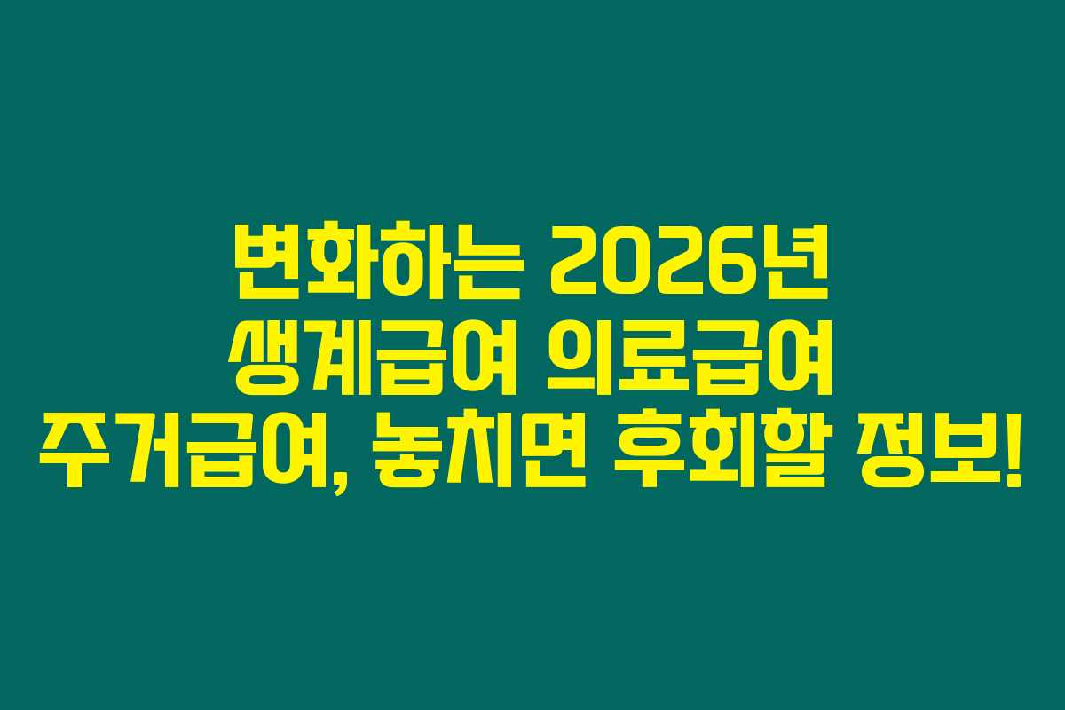 2026년부터 시행될 생계급여, 의료급여, 주거급여의 핵심 내용을 알고 계신가요? 이 글을 통해 새로운 변화와 더불어 수급 자격이 어떻게 달라지는지, 어떻게 준비해야 하는지를 꼼꼼히 짚어보겠습니다. 2026년에는 더 많은 분들이 혜택을 받게 되니까, 꼭 아래를 읽어보시면 좋겠어요.